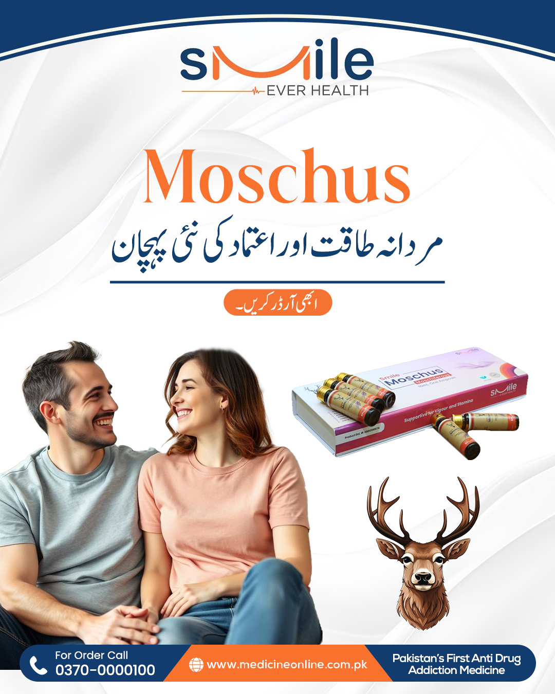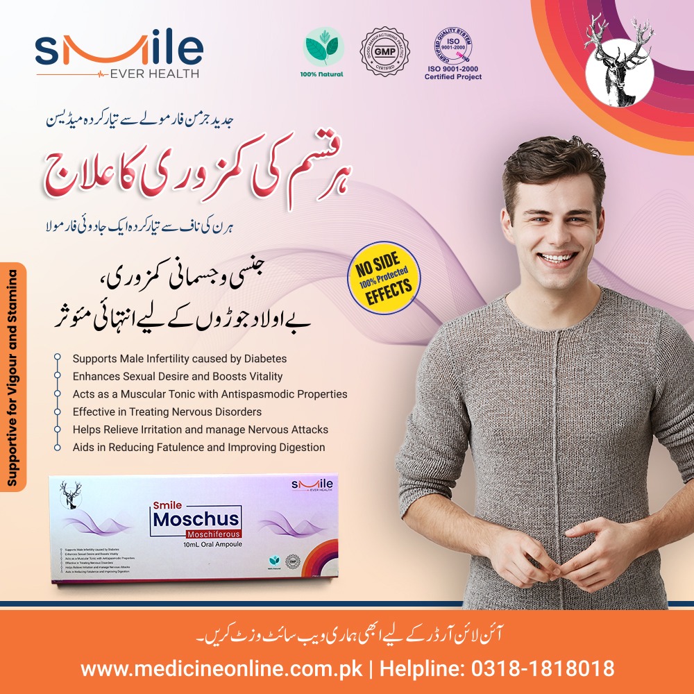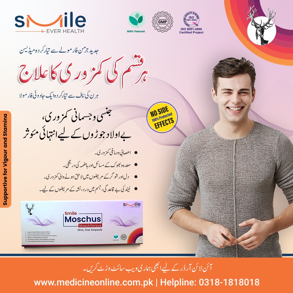 ماسکس (Moschus) جس کو کستوری بھی کہا جاتا ہے، یہ مسک نامی نر ہرن کے نافہ میں بنتا ہے، نافہ سے نکلنے والے اس میٹیریل کو جدید سائنٹیفک طریقہ کار سے پینے والے ایمپولز کی شکل میں تیار کیا گیا ہے جو ہر قسم کی کمزوری کو ختم کرنے میں اکثیر کا درجہ رکھتے ہیں، ایسی کمزوری جس میں دوسری تمام ادویات اور وٹامنز کچھ رزلٹ نا دیں وہاں پر Moschus جادو کی طرح اپنا اثر دکھاتی ہے اور ایک ماہ کے استعمال سے جسم کو بھرپور اور منفرد قسم کی طاقت ملتی ہے، یہ پروڈکٹ مرد حضرات کے لئے خاص تحفہ ہے خاص طور پر ایسے حضرات جو بڑھتی عمر کے ساتھ اپنے آپ کو کمزور محسوس کرنے لگیں اور اپنے ساتھی کو خوش نا کر پائیں