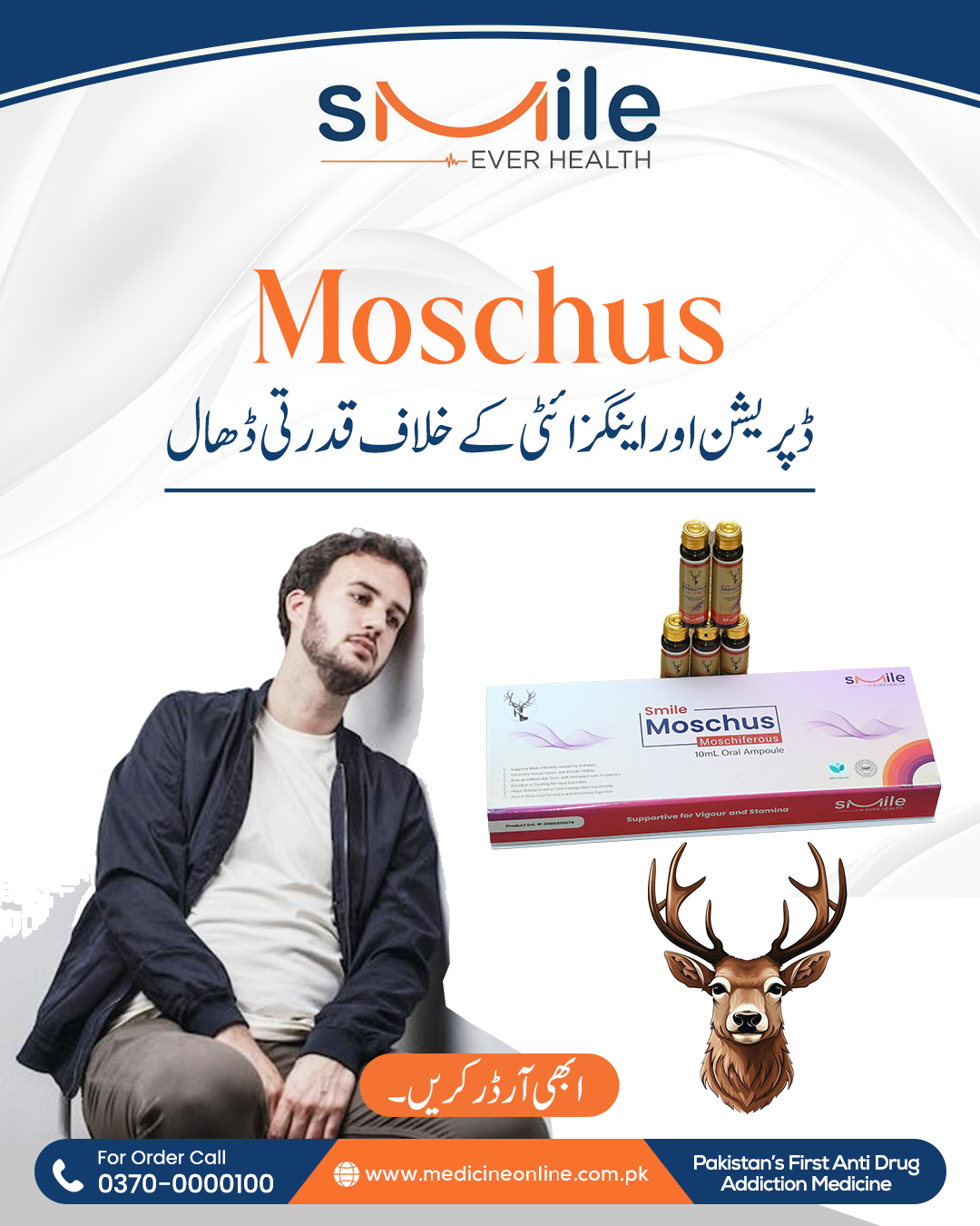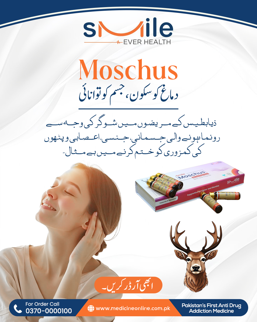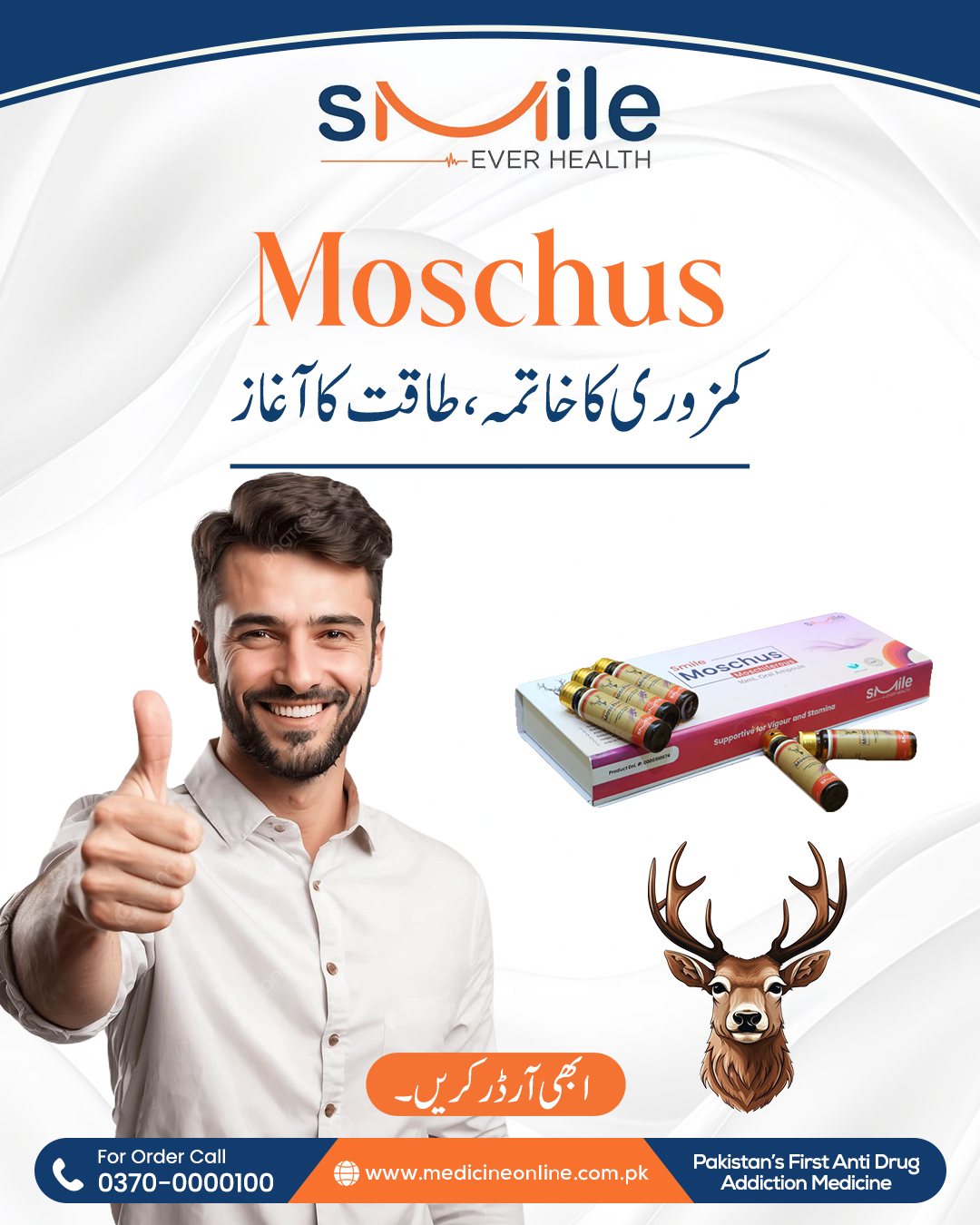ماسکس (Moschus) جس کو کستوری بھی کہا جاتا ہے، یہ مسک نامی نر ہرن کے نافہ میں بنتا ہے، نافہ سے نکلنے والے اس میٹیریل کو جدید سائنٹیفک طریقہ کار سے پینے والے ایمپولز کی شکل میں تیار کیا گیا ہے جو ہر قسم کی کمزوری کو ختم کرنے میں اکثیر کا درجہ رکھتے ہیں، ایسی کمزوری جس میں دوسری تمام ادویات اور وٹامنز کچھ رزلٹ نا دیں وہاں پر Moschus جادو کی طرح اپنا اثر دکھاتی ہے اور ایک ماہ کے استعمال سے جسم کو بھرپور اور منفرد قسم کی طاقت ملتی ہے، یہ پروڈکٹ مرد حضرات کے لئے خاص تحفہ ہے خاص طور پر ایسے حضرات جو بڑھتی عمر کے ساتھ اپنے آپ کو کمزور محسوس کرنے لگیں اور اپنے ساتھی کو خوش نا کر پائیں